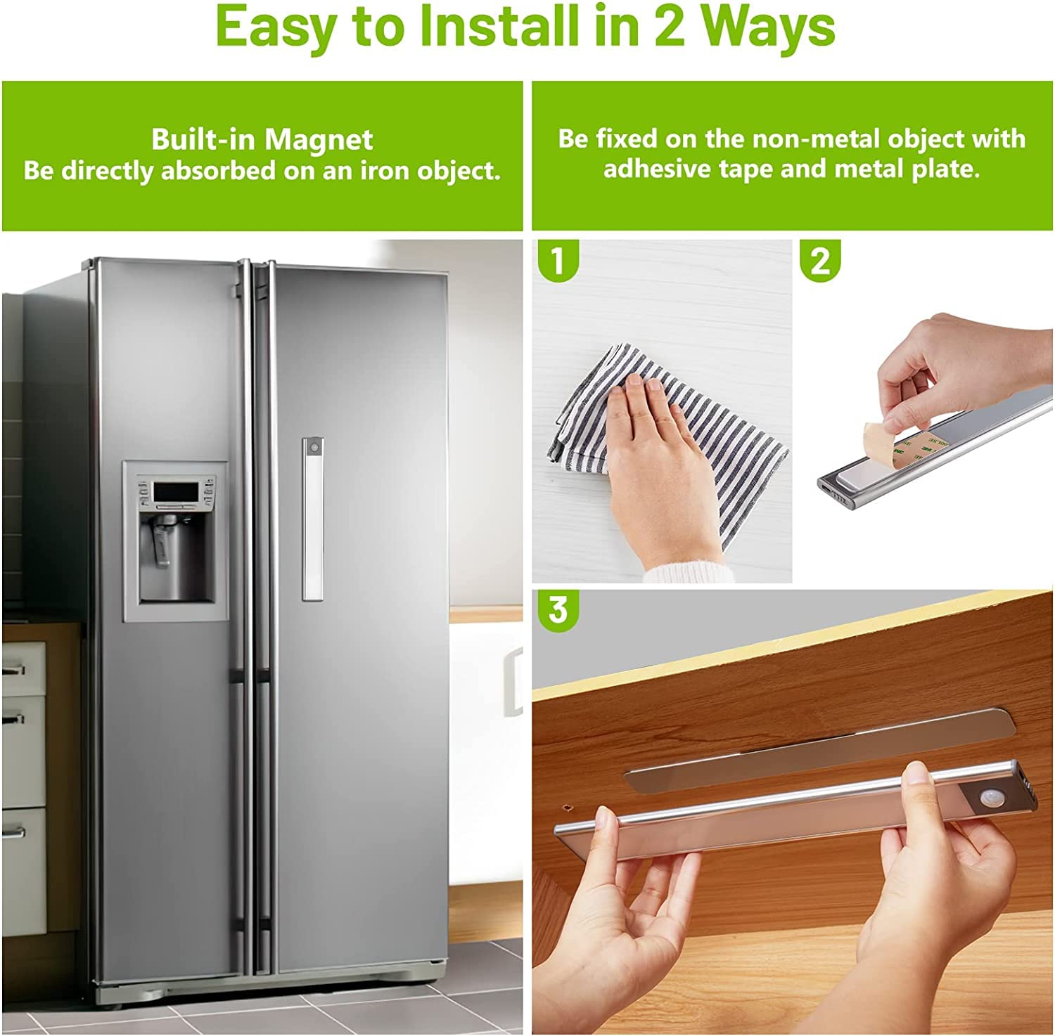 Peel and stick the metal strip, then place the magnetic light on it. No wiring, no drilling. Remove anytime for charging.